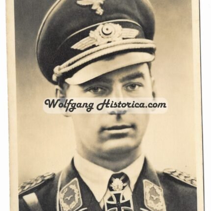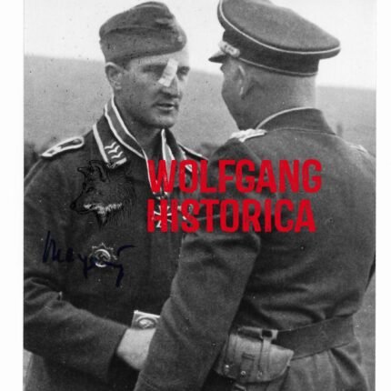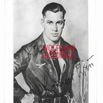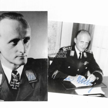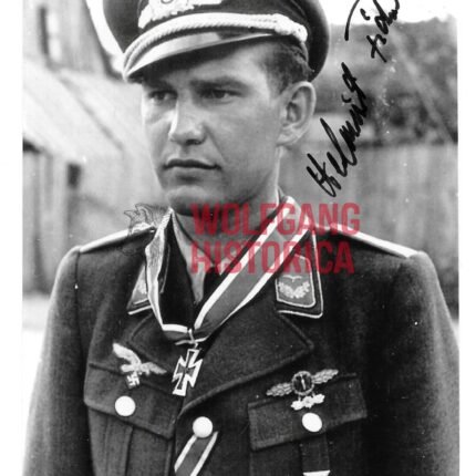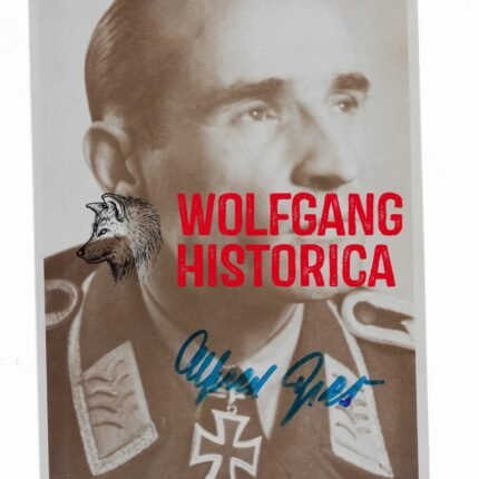 Original Postwar Signature on a Postwar Photocopy of Dieter Pekrun. Major Dieter Pekrun (15.07.1917 † 18.07.2005) earned the Deutsches Kreuz in Gold on February 5, 1942 as Oberleutnant in the Stab/ Stukageschwader 2 “Immelmann” and the Ritterkreuz on June 24, 1941 as Oberleutnant und Adjutant of the I. Gruppe/ Stukageschwader 2 “Immelmann”. Good condition. Signature somewhat faded from the front and difficult visible due green inkt. Measuring: 8,8×11,4cm. Comes with an extra signed letter.
