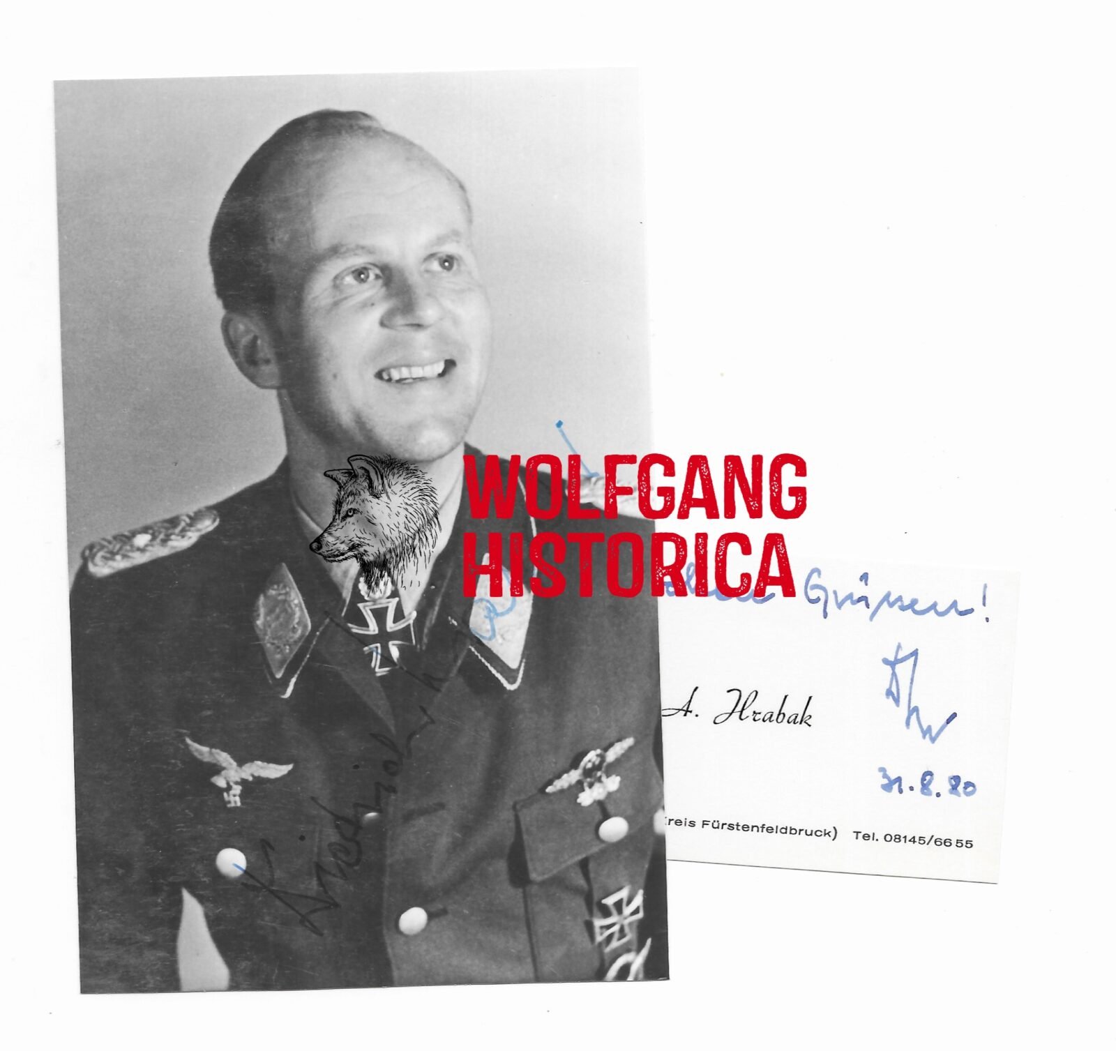 Original Postwar Signature on a Postwar Photo & Card of Dietrich “Dieter” Hrabak. Oberst Dietrich Hrabak (19.12.1915 † 15.09.1995) earned the Ritterkreuz on October 21, 1940 as Hauptmann und Kommandeur of the II. Gruppe/ Jagdgeschwader 54 “Grünherz” (after 16 earial victories), the Eichenlaub on November 25, 1943 as Oberstleutnant und Kommodore of the Jagdgeschwader 52.
