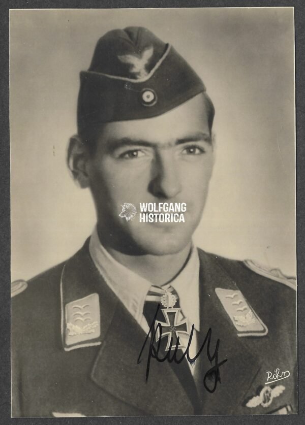 Peltz’s combination of frontline combat command with Stuka units and his later role as a strategic bombing planner make him an especially interesting figure. His awards — the Knight’s Cross with Oak Leaves and Swords — place him among the most highly decorated Luftwaffe officers, making his signed photo a desirable addition for collectors of decorated bomber leaders and high-ranking Luftwaffe personalities.