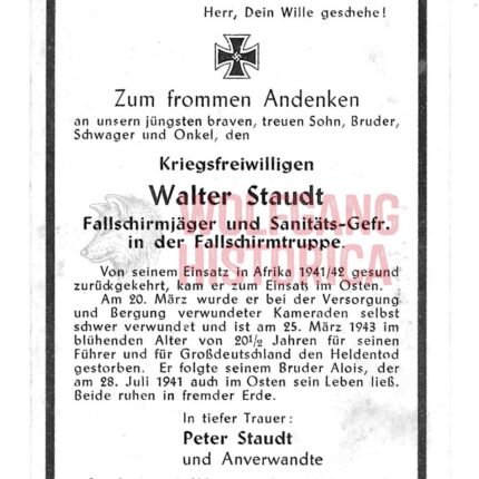 Awarded for his actions during the Battle of Crete. As all the officers of the I./Fallschirmjäger-Sturm-Regiment 1 had fallen, Neumann took over the leadership of the rest of the Bataillon. Oberleutnant Trebes, commanding the remnants of the Stoßgruppe Braun, also attached himself to Neumann’s group. Acting on his own initiative, Dr. Neumann decided to capture the NW part of Hill 107 and eliminate the Allied AA guns there that commanded the Maleme airfield. In this he was successful, with this action being the turning point of the whole battle. After returning to his nominal duties, he was then ordered by the newly arrived Oberst Ramcke to take over the Bataillon once again. Thus, on the morning of 22.05.1941, Neumann divided the Bataillon into 2 Kompanien. The next day Neumann and his men took the role of Vorausabteilung, and advanced ahead of the left wing of the II. Bataillon towards the east. At 17:00 he reached the village of Modea. The next day, while on the hill south of Platania, the Bataillon halted as the attack had been postponed. Finally, on the 24.05.1941, Oberleutnant Stolz took over the leadership of the Bataillon and Neumann could finally return to looking after the many wounded for good. In this capacity he also distinguished himself outstandingly.