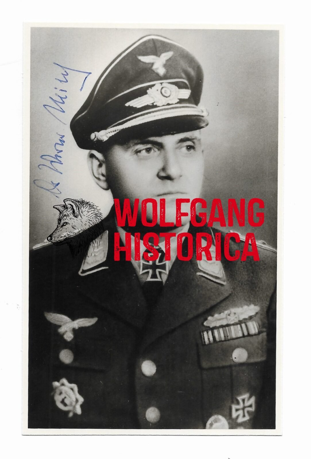 Original Postwar Signature on a Postwar Photo of Dr.jur. Werner Wolfgang Milch. Major Dr. Werner Milch (15.11.1903 in Wilhelmshaven † 17.11.1984 in Hemer) earned the Deutsches Kreuz in Gold on April 15, 1944 with the Fallschirm-Artillerie-Regiment 2 and the Ritterkreuz des Eisernen Kreuzes on January 9, 1945 as Hauptmann und Kommandeur of the Fallschirm-Granatwerfer-Lehr und Versuchs-Bataillon of the 1. Fallschirm-Armee.