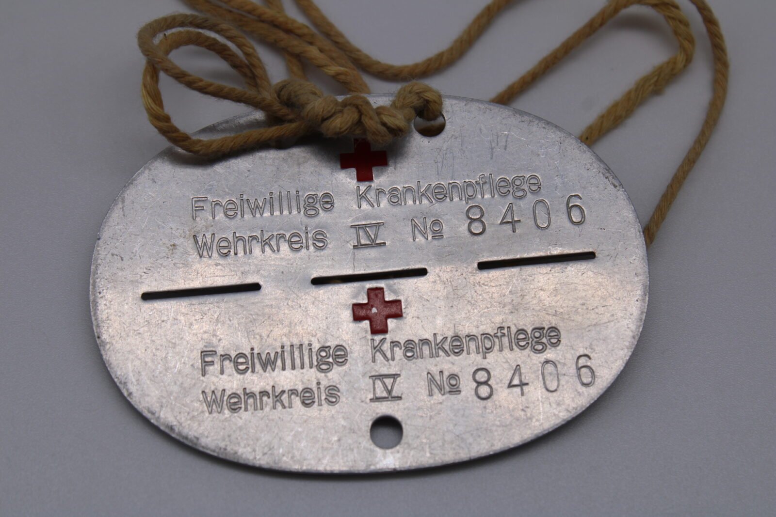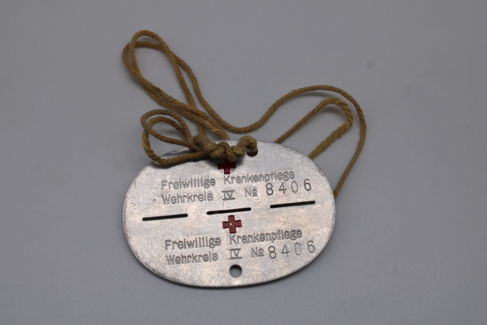 Original DRK (Deusches Rotes Kreuz) Erkennungsmarke “Freiwillige Krankenpflege – Wehrkreis IV – Nr. 8406“. Wehrkreis IV was District Dresden. Condition as seen.