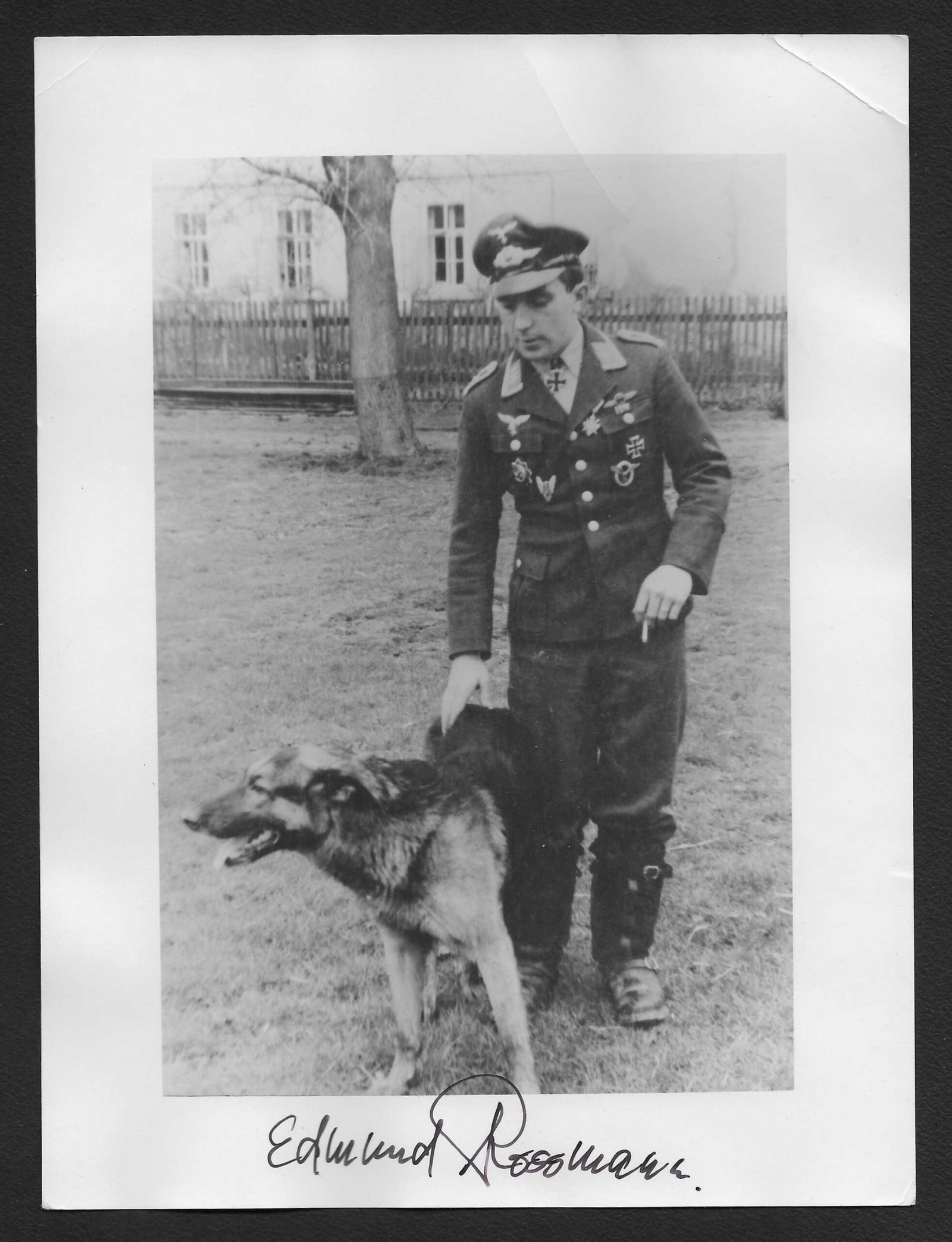 Original Postwar Signature on a Postwar Photo of Edmund Roßmann. Feldwebel Edmund Roßmann (11.01.1918 † 04.04.2005) flew a total of 640 sorties during the war, achieving 93 aerial victories. He earned the Deutsches Kreuz in Gold on January 22, 1942 as Feldwebel in the III. Gruppe/ Jagdgeschwader 52 and the Ritterkreuz des Eisernen Kreuzes on March 19, 1942 as Feldwebel and Flugzeugführer of the 7. Staffel, III. Gruppe/ Jagdgeschwader 52. Good condition. A5 Size.
