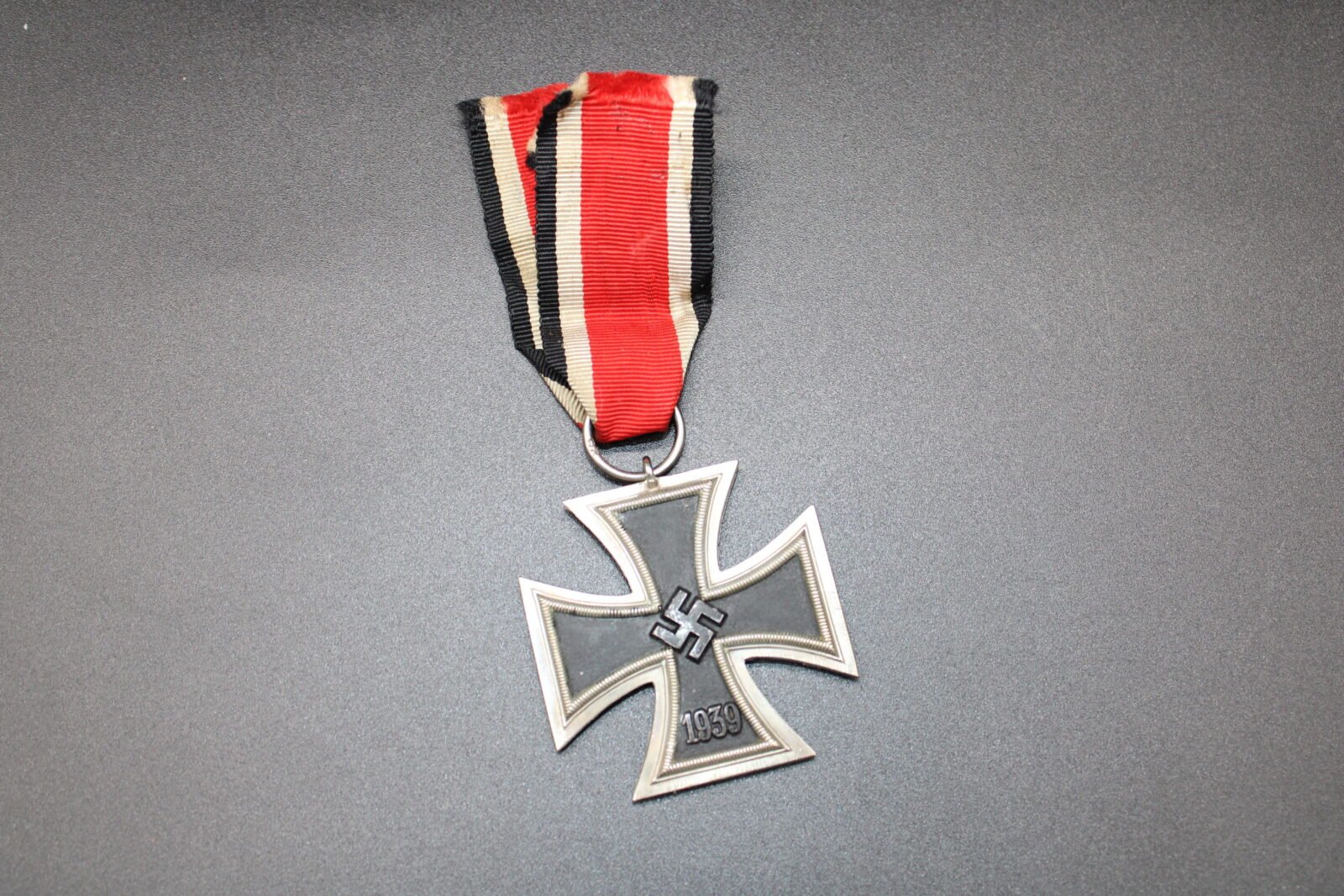 Original Eisernes Kreuz 2. Klasse (Iron Cross 2nd Class), which was awarded for bravery in the course of combat. Maker marked with “25” for Arbeitsgemeinschaft der GGSI, Hanau am Main. Complete with ribbon. Condition as seen.