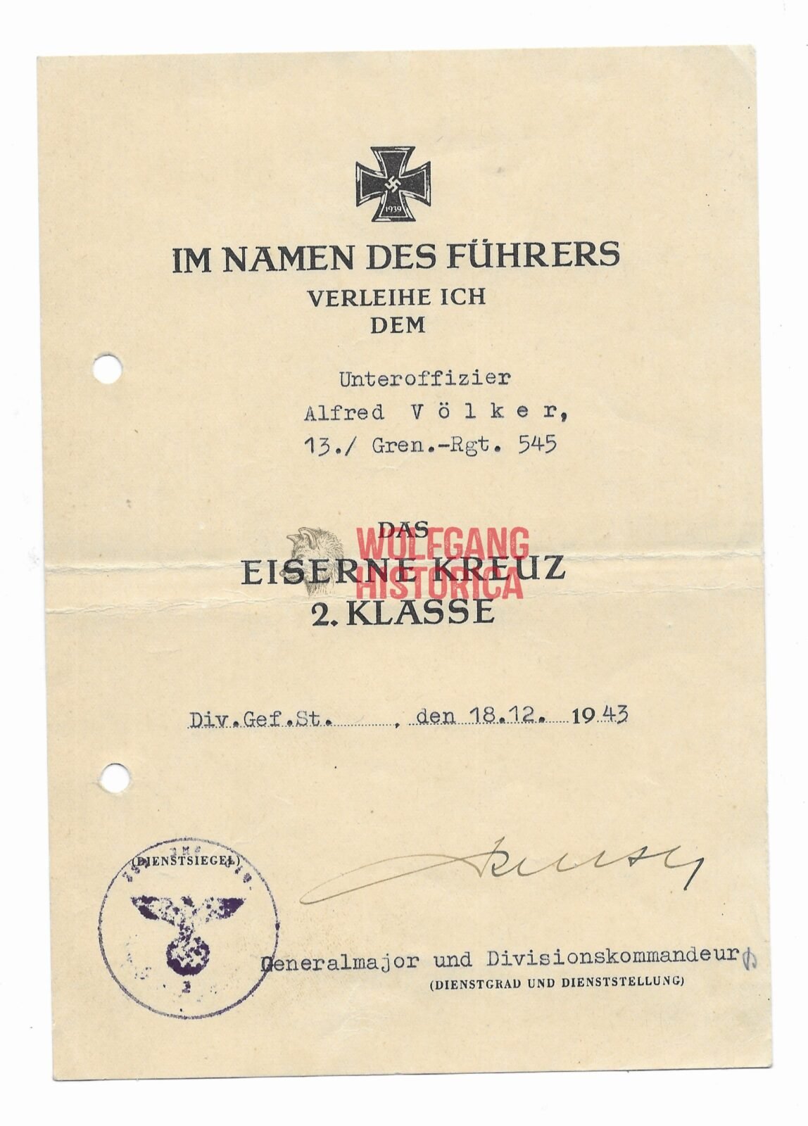 Award document of Unteroffizier Alfred Völker, who served with the 13. Kompanie/ Grenadier-Regiment 545 of the 389. Infanterie-Division for the Eisernes Kreuz 2. Klasse (Iron Cross 2nd Class) for his service on December 18, 1943. Document was signed by Generalleutnant Kurt Kruse (DKIG). Has been folded in the past. Punch holes visible.