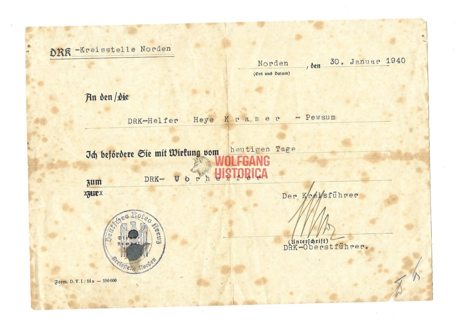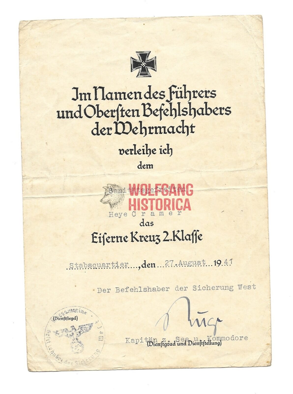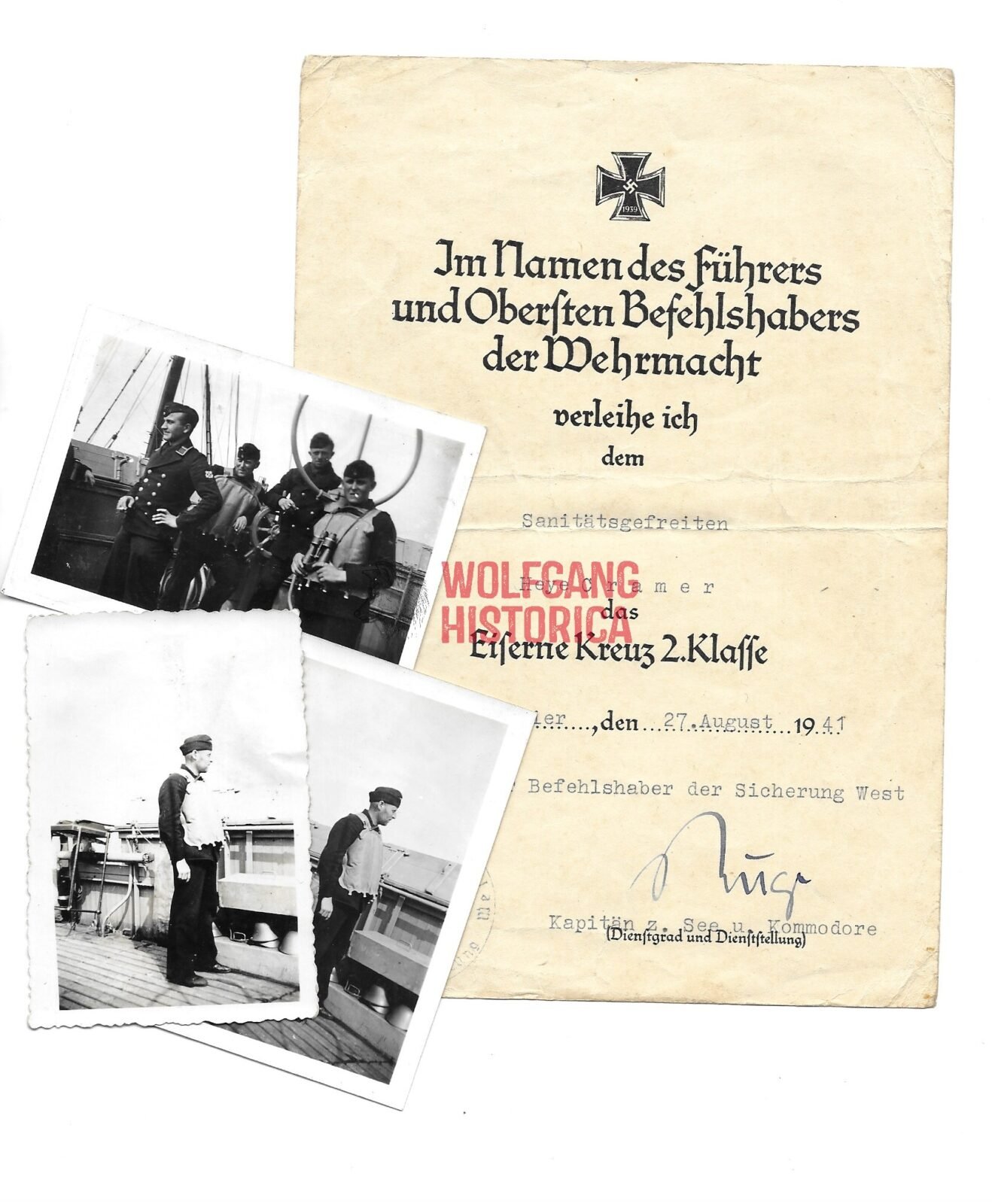 Award document of Sanitätsgefreiter Heye Cramer for the Eisernes Kreuz 2. Klasse (Iron Cross 2nd Class) for his service on August 27,5, 1941. Document was signed by Kapitän zur Zee Friedrich Ruge (RK) as Kommodore of Minensuchboote West. 3x Photos come with it & DRK promotion document.