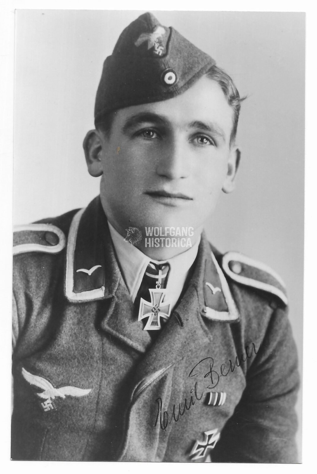 Original Postwar Signature on a Postwar Photo of Emil Berner. Unteroffizier Emil Berner (04.12.1921 † 13.06.2008) earned the Ritterkreuz des Eiseren Kreuzes on November 3, 1942 as Gefreiter der Reserve und Richtkanonier in the 3. Batterie/ Flak-Regiment 18 in North Africa.