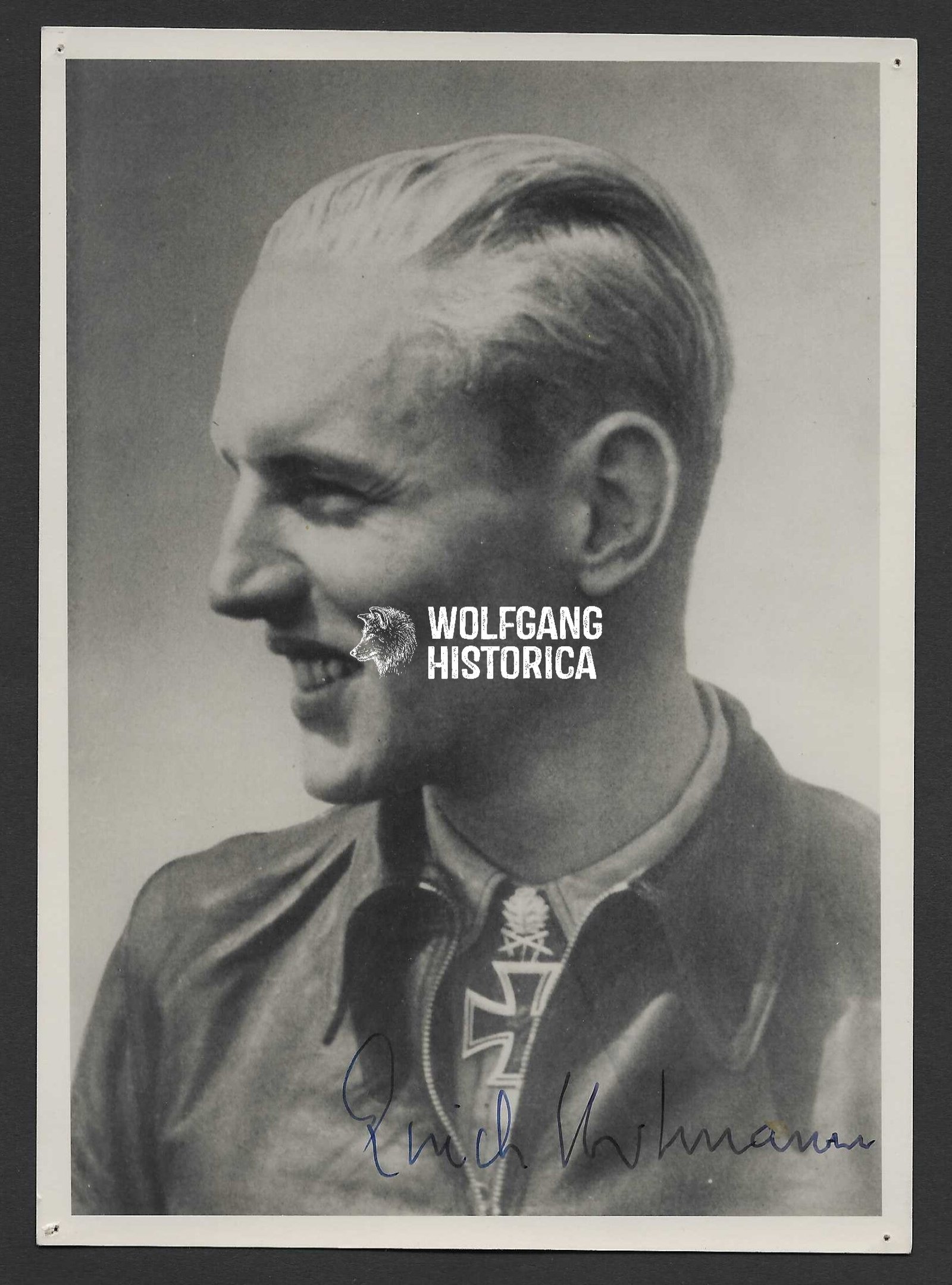 Original Postwar Signature on a Postwar Photo of Erich “Bubi” Hartmann. Major Erich Alfred “Bubi” Hartmann (19 April 1922, Weissach, Württemberg – 20 September 1993, Weil im Schönbuch, Germany) was the most successful fighter ace in aviation history, credited with an unparalleled 352 confirmed aerial victories on the Eastern Front. Known as “The Blond Knight of Germany”, Hartmann flew with Jagdgeschwader 52 (JG 52) and became one of the most decorated Luftwaffe fighter pilots of the Second World War. His skill, discipline, and survival across more than 1,400 combat missions earned him legendary status among pilots of all nations.