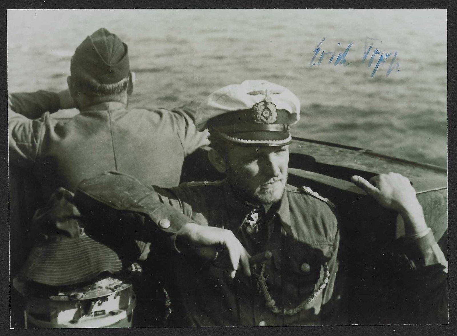 Original Postwar Signature on a Postwar Photo of Erich Topp. Fregattenkäpitan Erich Topp (02.07.1914 † 26.12.2005) earned the Ritterkreuz des Eisernen Kreuzes on June 20, 1941 as Oberleutnant zur See und Kommandant of Uboot “U-552”, the Eichenlaub on April 11, 1942 as Kapitänleutnant und Kommandant of Uboot “U-552” and the Schwertern on August 17, 1942 as Kapitänleutnant und Kommandant of Uboot “U-552”. Postcardsize.