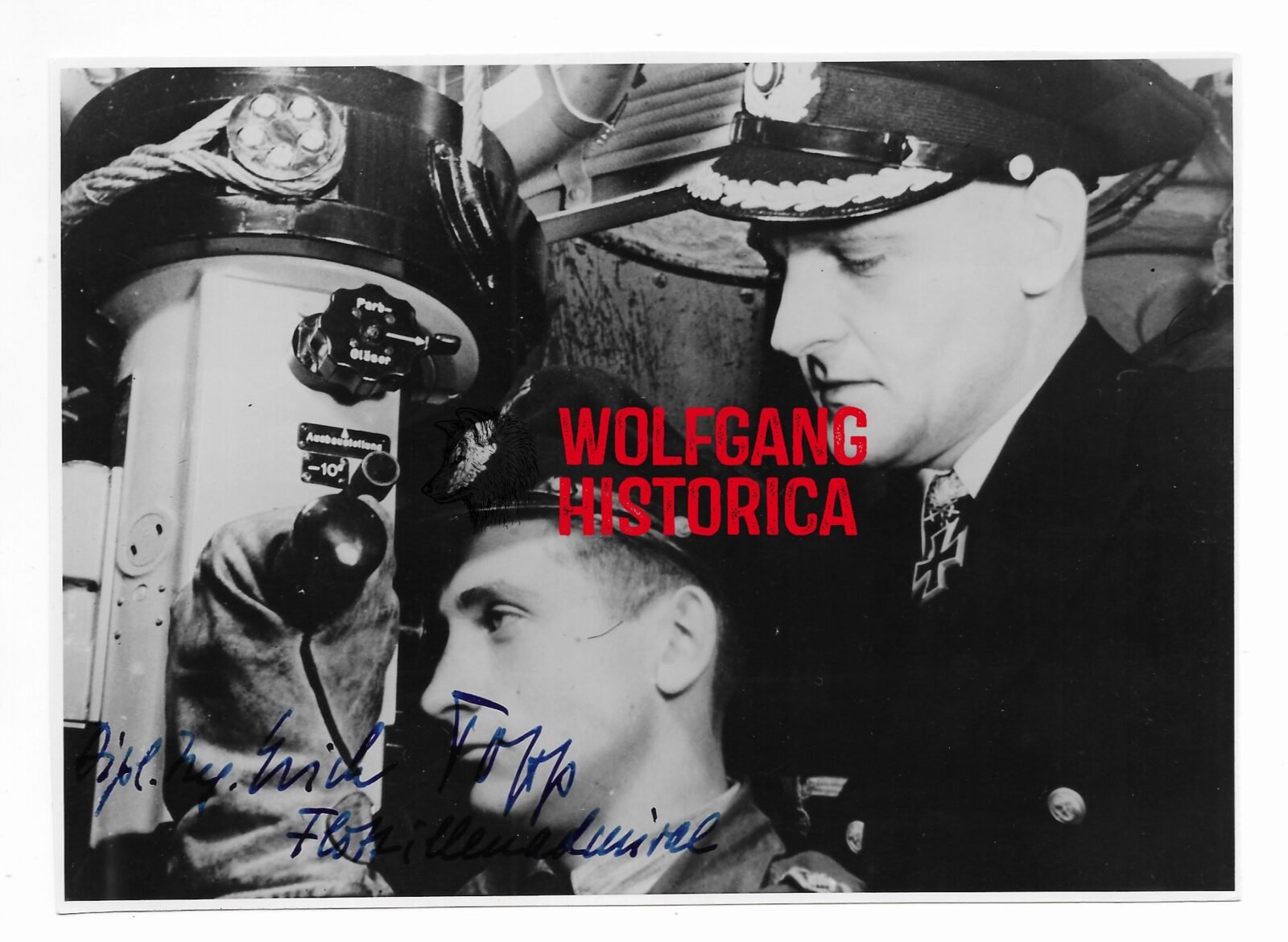 Original Postwar Signature on a Postwar Photo of Erich Topp. Fregattenkäpitan Erich Topp (02.07.1914 † 26.12.2005) earned the Ritterkreuz on June 20, 1941 as Oberleutnant zur See und Kommandant of Uboot “U-552”, the Eichenlaub on April 11, 1942 as Kapitänleutnant und Kommandant of Uboot “U-552” and the Schwertern on August 17, 1942 as Kapitänleutnant und Kommandant of Uboot “U-552”. Good condition. Larger size (ca. A5)