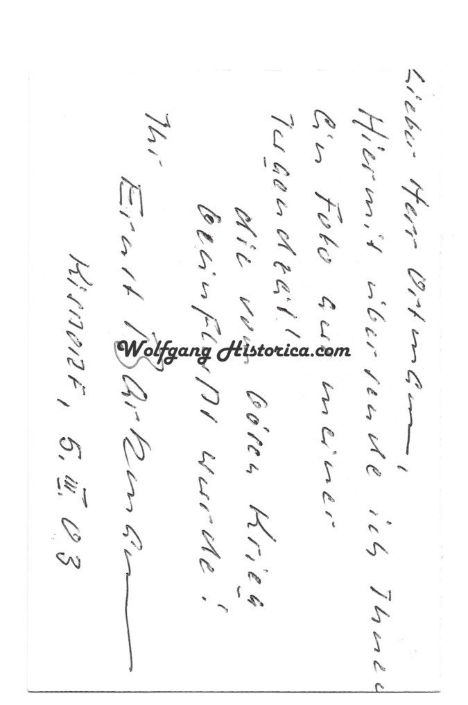 Original Postwar Signature on a Postwar (Hard Carton) Photocopy of Ernst Barkmann. SS-Oberscharführer Ernst Barkmann (25.08.1919 † 27.06.2009) earned the Ritterkreuz on August 27, 1944 as SS-Unterscharführer und Panzerkommandant in the 4. Kompanie/ SS-Panzer-Regiment 2 of the 2. SS-Panzer-Division “Das Reich”. Good condition. Measuring: Postcardsize. Signed on the reverse, likely it is a paper pasted on the back but very well done, you don’t see or feel a difference.