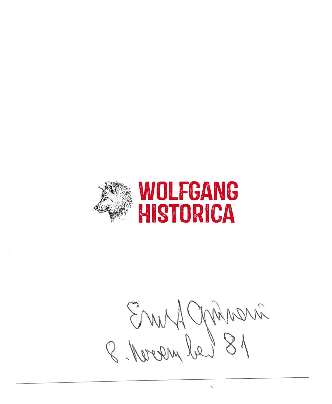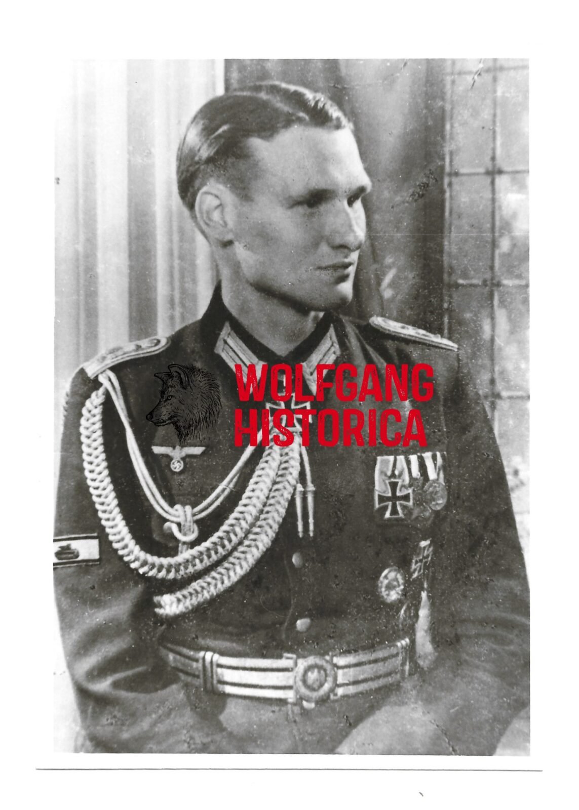 Original Postwar Signature on a Postwar Photo of Ernst Grunau. Oberleutnant Ernst Grunau (28.09.1919 † 08.07.1989) earned the Ritterkreuz on October 4, 1944 as Oberleutnant und Führer of the Divisions-Begleit-Kompanie/ 14. Panzer-Division, the Nahkampfspange in Gold on February 9, 1945 and the Deutsches Kreuz in Gold on March 24, 1945 as Oberleutnant und Chef of the Divisions-Begleit-Kompanie/ 14. Panzer-Division. Signed on reverse.