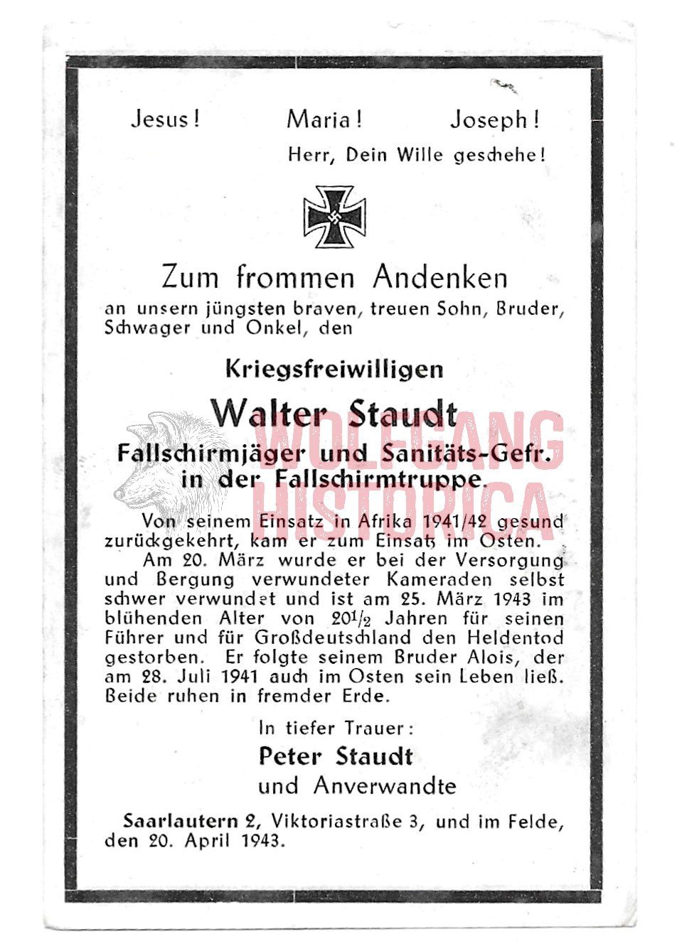 Death Card of Sanitäts-Gefreiter Walter Staudt, who served in the Fallschirmjägertruppe, when he died of his wounds on March 25, 1943 in Cholm, Soviet-Union. Served with Fallschirm-Artillerie-Regiment 1?