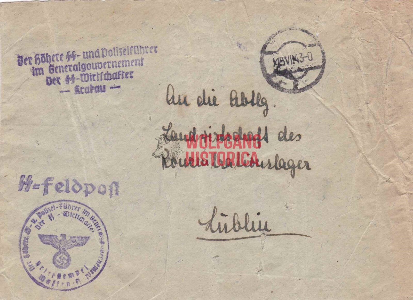 Feldpostenveloppe adressed to the Landwirtschaft-Abteilung of the Konzentrationslager Lublin (Concentration Camp Lublin) sent by the SS- und Polizeiführer im Generalgouvernement der SS-Wirtschafter Krakau!