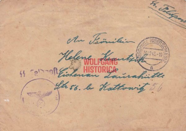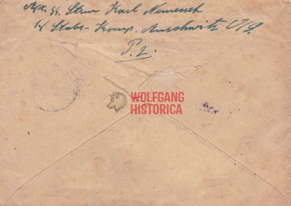 Feldpostenveloppe which was sent from by a member of the SS-Stabskompanie of the Concentration Camp Auschwitz! Possibly written by a SS-Sturmmann Karl Nemeczek? Stamp on the front unreadable but also bears a postal stamp for Auschwitz/Oberschlesien. Used condition. RARE.