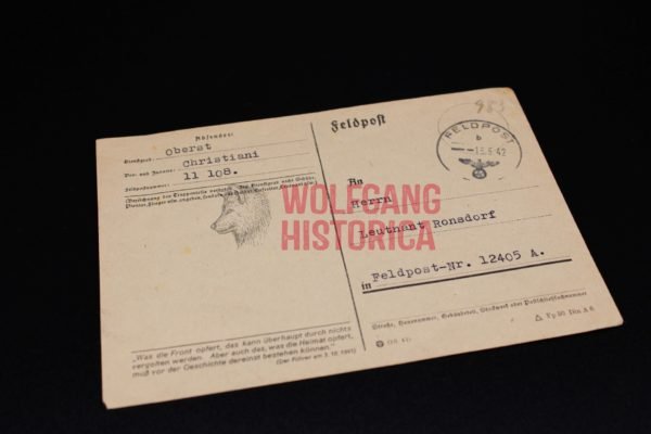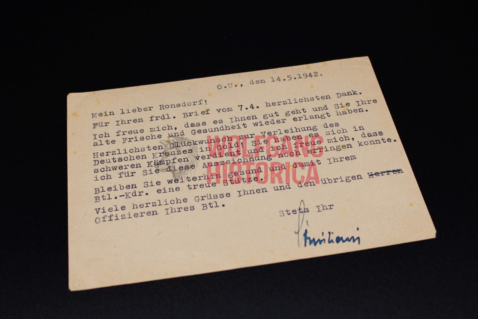 Feldpostkarte from Oberst Horst Christiani, who earned the Deutsches Kreuz in Gold with Infanterie-Regiment 508 of the 292. Infanterie-Division, to Leutnant Karl Ronsdorf who earned Deutsches Kreuz in Gold with the same regiment.