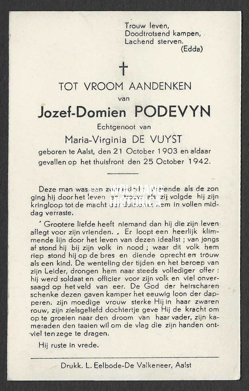 Original Flemish collaboration Death card of Jozef-Domien Podevyn, who was murdered on 25 october 1942. Commander of the Fabriekswacht. Condition as seen.
