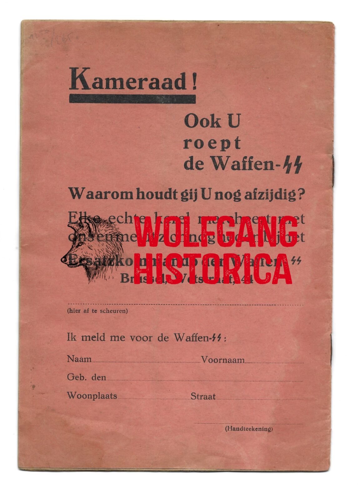 Original Waffen-SS Recruitment booklet “Vlaanderen vraagt Soldaten” (Flanders asks for Soldiers) for the Flemish Waffen-SS volunteers! Illustrated card cover, fully complete with 16 pages of text and mono photos and the reverse of the booklet is still there as this could be torn (when data was written to sign up). Size: 15,5×22 cm. Condition as seen.