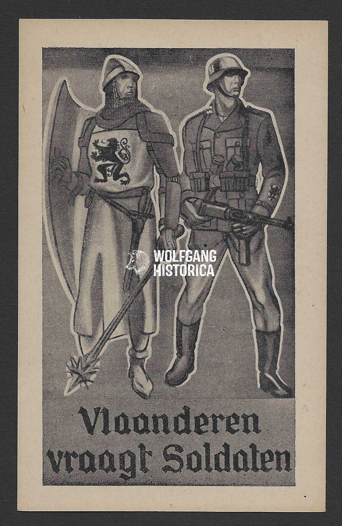 Original World War II Flemish Waffen-SS recruitment postcard bearing the slogan “Vlaanderen vraagt Soldaten” (“Flanders calls for soldiers”). The design depicts a medieval Flemish warrior alongside a modern Waffen-SS soldier, symbolizing historical continuity and used as propaganda to encourage Flemish enlistment.