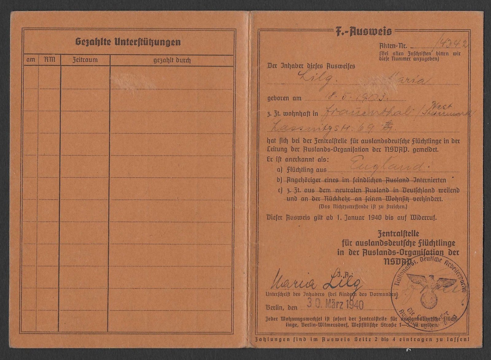 Original “F.-Ausweis” (Flüchteling-Ausweis) from an Austrian born female, who fled from England back to Austria. Condition as seen.