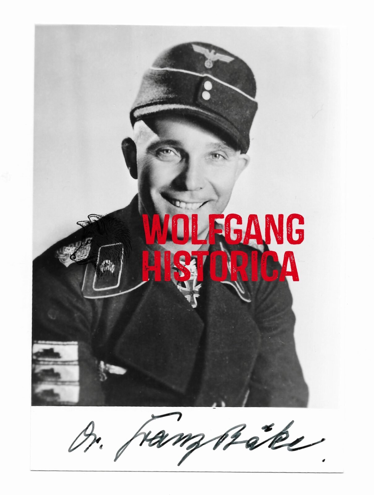 Original Postwar Signature on a Postwar Photo of Franz Bäke. Generalmajor Frankz Bäke (28.02.1898 † 12.12.1978) earned the Ritterkreuz des Eisernen Kreuzes on January 11, 1943 as Major der Reserve und Kommandeur and the Eichenlaub on August 1, 1943 with II. Abteilung/ Panzer-Regiment 11 of the 6. Panzer-Division and the Schwertern on February 21, 1944 as Oberstleutnant der Reserve und Kommandeur of the Panzer-Regiment 11 of the 6. Panzer-Division. He also earned the Panzerkampfabzeichen IV. Stufe (Einsatzzahl “100”). Good condition.