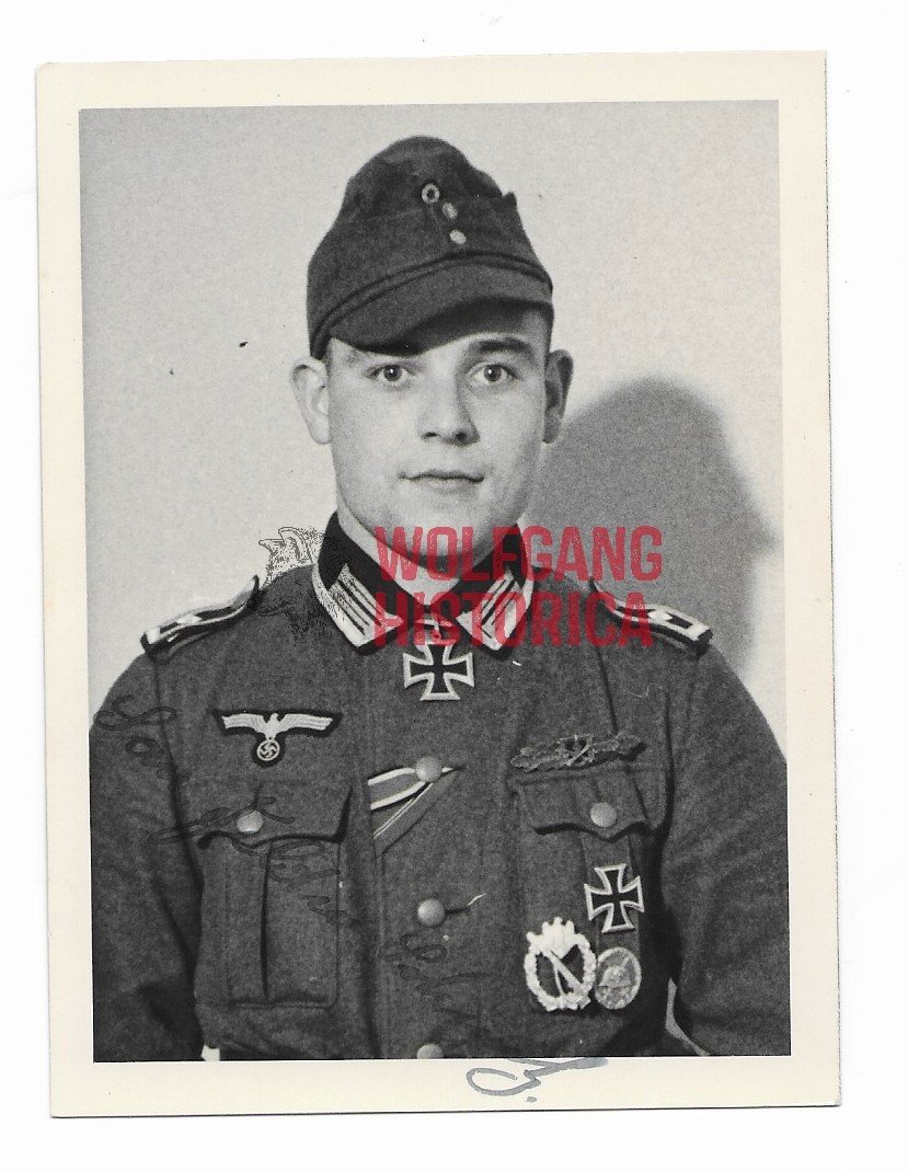 Original SCARCE Wartime Studioportrait with Wartime Signature of Franz Schmitz. Oberfeldwebel Franz Schmitz (12.10.1918 † 11.06.1957) earned the Ritterkreuz on September 13, 1943 as Sanitäts-Unteroffizier und Gruppenführer in the 3. Kompanie/ Grenadier-Regiment 279 of the 95. Infanterie-Division. Measuring: 9×12 cm.