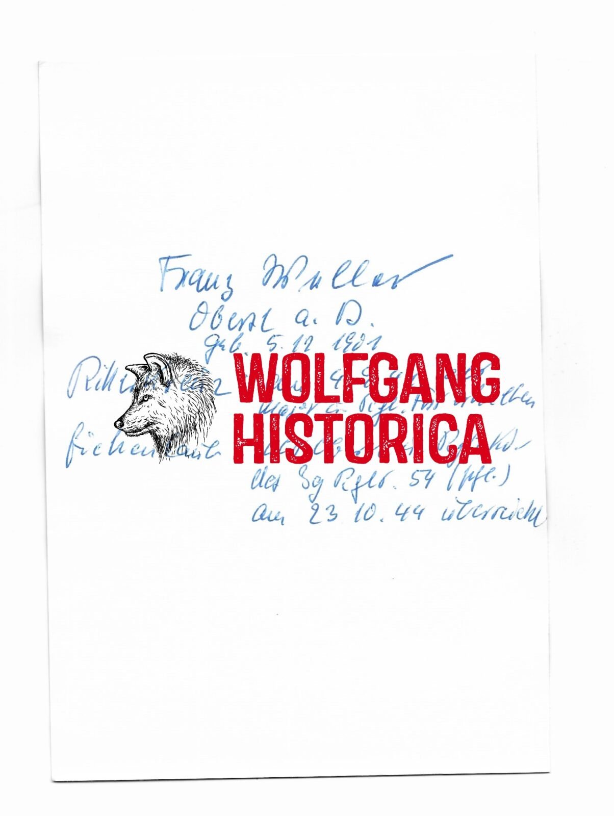 Original Postwar Signature on a Postwar Photo of Franz Weller. Oberst Franz Weller (05.12.1901 in Berlin † 14.08.1994 in Köln) earned the Ritterkreuz des Eisernen Kreuzes on September 4, 1941 as Major und Führer of Infanterie-Regiment 54 and the Eichenlaub on October 23, 1944 as Oberst und Kommandeur of the Jäger-Regiment 54 of the 100. Jäger-Division.