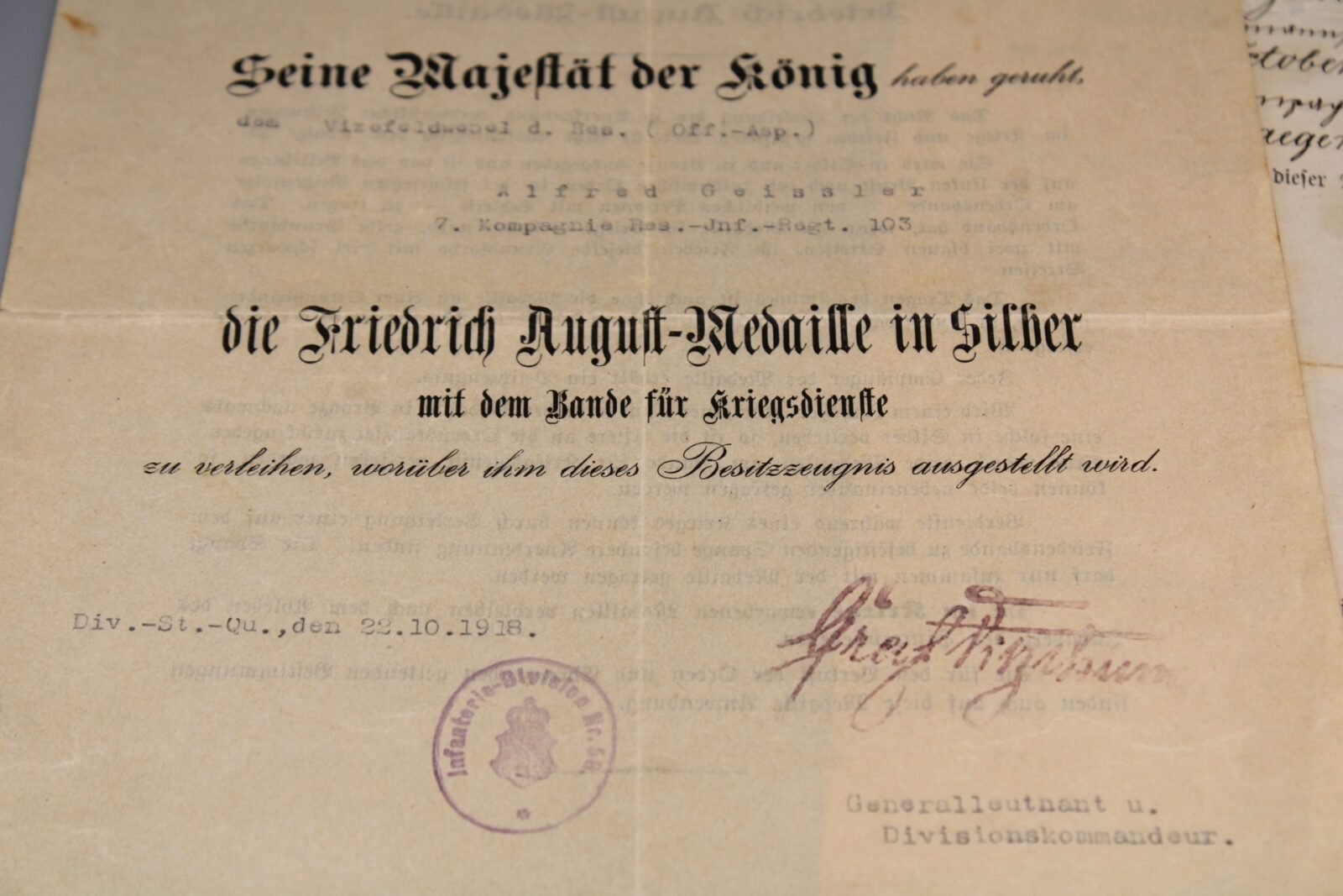 Award document for the Friedrich August-Medaille in Bronze am Kriegsband with extra document for a soldier who served with the Reserve-Infanterie-Regiment 103!