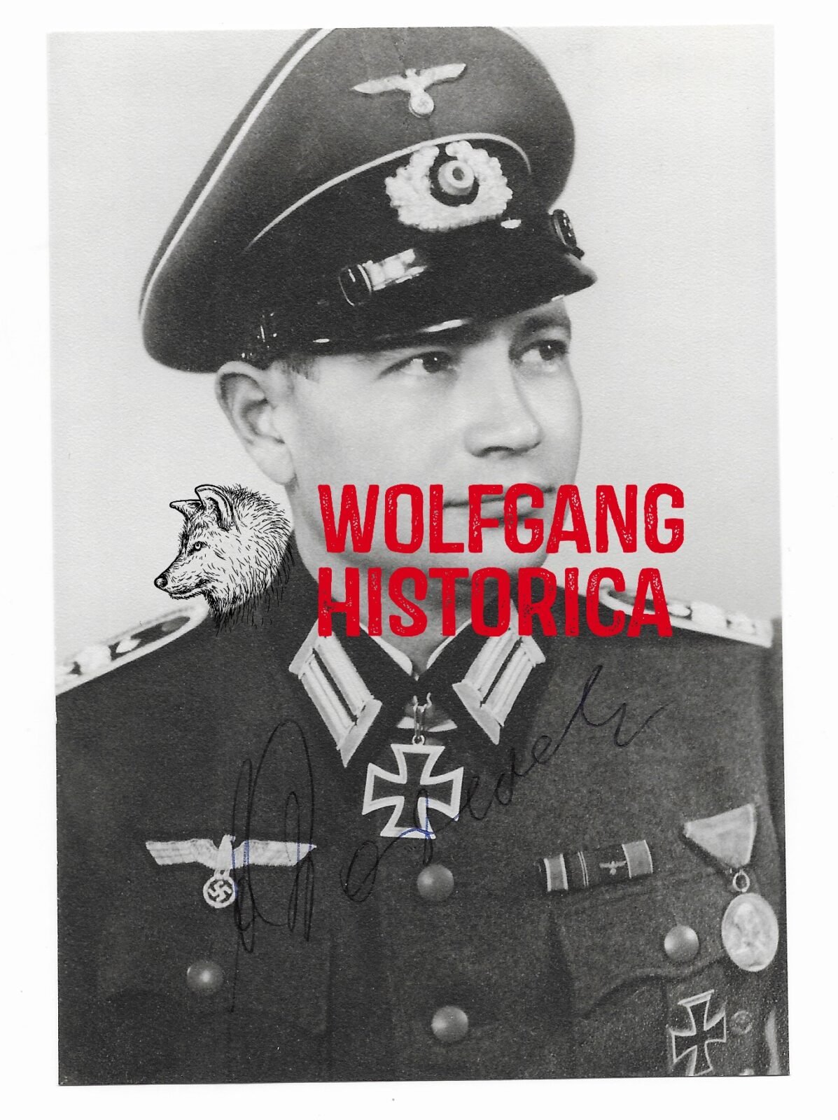 Original Postwar Signature on a Postwar Photo of Friedrich-Karl Warwel. Stabsfeldwebel Friedrich-Karl Warwel (11.05.1912 in Molthainen † 02.04.1980 in Bomlitz-Benefeld) earned the Ritterkreuz des Eisernen Kreuzes on September 13, 1943 as Stabsfeldwebel und Zugführer in the 14. Kompanie/ Grenadier-Regiment 477 of the 257. Infanterie-Division.