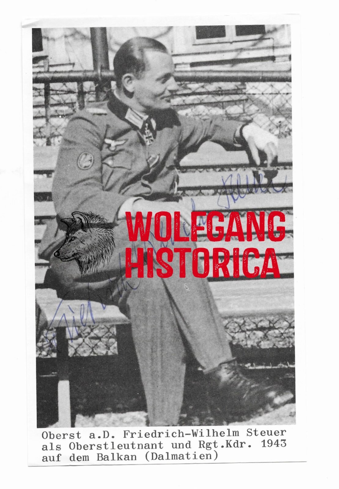 Original Postwar Signature on a Postwar Photo of Friedrich-Wilhelm Steuer. Oberst Friedrich-Wilhelm Steuer (19.02.1906 in Hamburg † 26.06.1979 in Frankfurt) earned the Ritterkreuz des Eisernen Kreuzes on August 26, 1943 as Major und kommandeur of the III. Bataillon/ Panzergrenadier-Regiment 129 of the 22. Panzer-Division. Bit larger as PC.