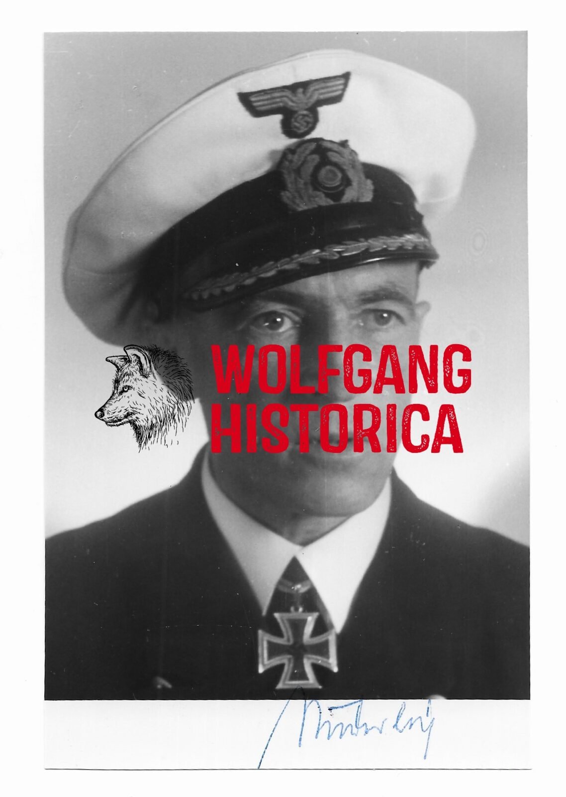 Original Postwar Signature on a Postwar Photo of Friedrich Wunderlich. Korvettenkapitän Friedrich Wunderlich (13.08.1891 in Bückeburg † 27.03.1977 in München) earned the Ritterkreuz des Eisernen Kreuzes on June 10, 1944 as Korvettenkapitän z.V. und Chef of the 14. U-Jagdflottille. Good condition.
