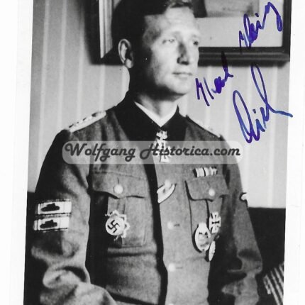 Original Postwar Signature on a Postwar Photocopy of Fritz Hahl. SS-Obersturmführer Fritz Hahl (22.12.1922-) earned the Deutsches Kreuz in Gold on December 7, 1944 while serving with 7. Kompanie/ SS-Panzer-Grenadier-Regiment 10 “Westland” of the 5. SS-Panzer-Division “Wiking”. Good condition. Postcardsize.