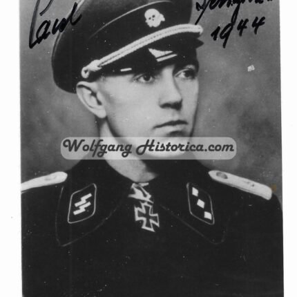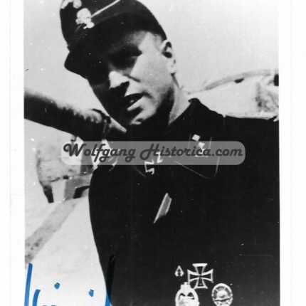 Original Postwar Signature on a Postwar Photocopy of Fritz Hahl. SS-Obersturmführer Fritz Hahl (22.12.1922-) earned the Deutsches Kreuz in Gold on December 7, 1944 while serving with 7. Kompanie/ SS-Panzer-Grenadier-Regiment 10 “Westland” of the 5. SS-Panzer-Division “Wiking”. Good condition. Postcardsize.