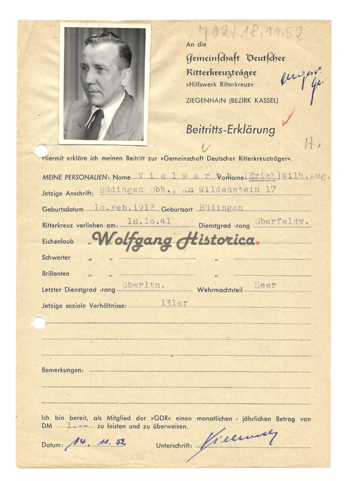 Original (document from after war!) Gemeinschaft Deutscher Ritterkreuzträger (GdR) Membership application of “Erich” Wilhelm-August Vielwerth. Oberleutnant (Erich) Wilhelm-August Vielwerth (10.02.1912-12.08.1997) earned the Ritterkreuz on October 18, 1941 as Oberfeldwebel and Zugführer in the 1. Kompanie/ Infanterie-Regiment 87 of the 36. Infanterie-Division. Also signed by him! With photo attached!