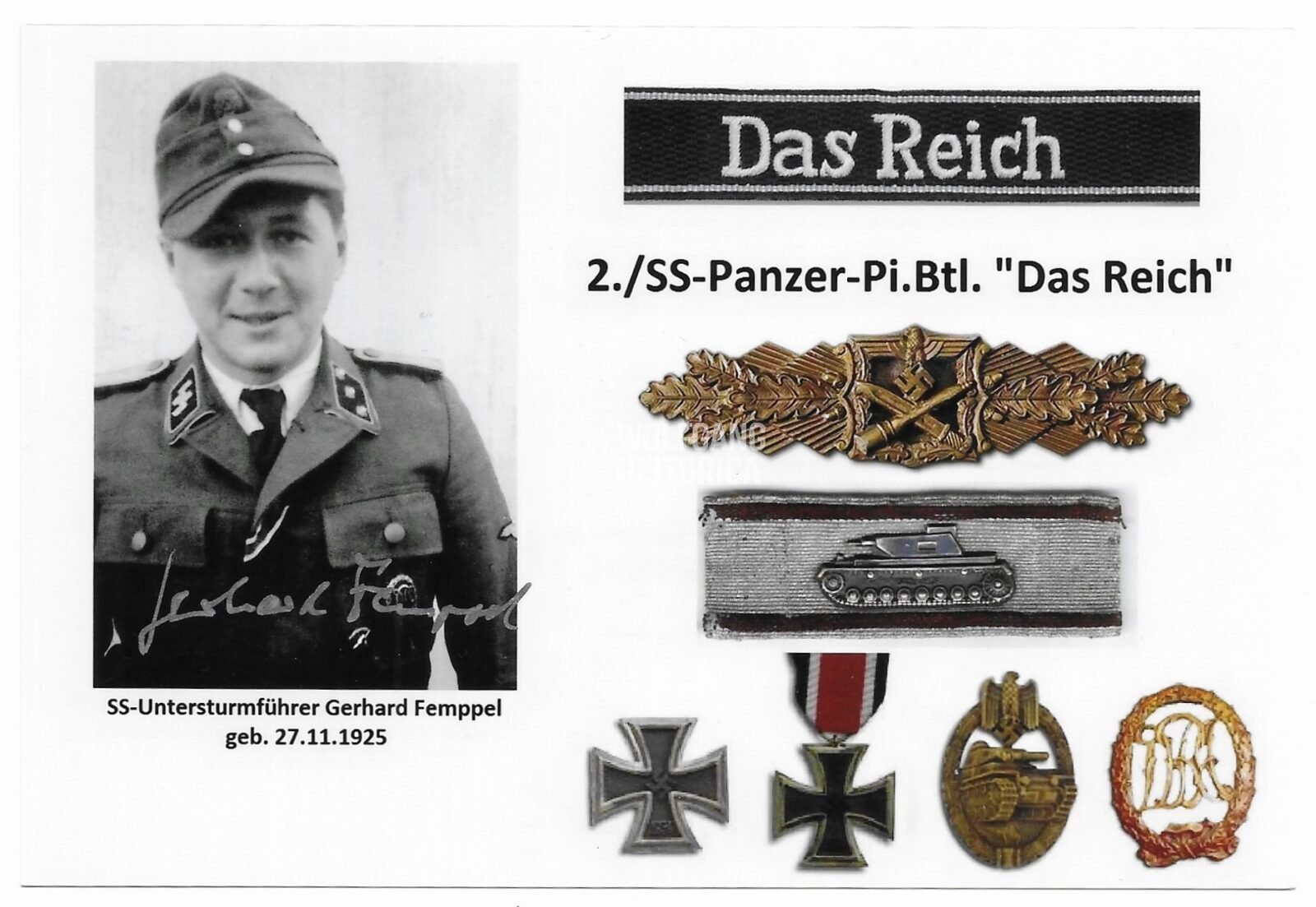 Original Postwar Signature on a Postwar Photo of Dr. Gerhard Femppel. SS-Untersturmführer Gerhard Femppel (27.11.1925-) served with the 2. Kompanie/ SS-Panzer-Pionier-Bataillon 2 of the 2. SS-Panzer-Division “Das Reich”. He fought in the Ardennes Offensive, Hungary.. Postcardsize. Good condition.