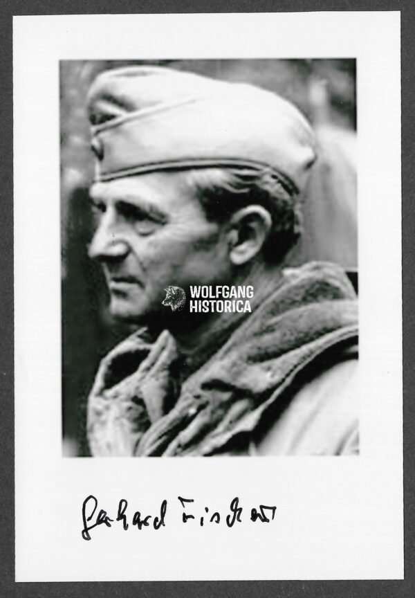 Original Postwar Signature on a Postwar Photo of Gerhard Fischer. Major Gerhard Fischer (4 December 1915 – 9 August 2014) was a decorated German Panzer officer of the 23. Panzer-Division during the Second World War. A front-line tank commander, he rose through the ranks to company command and earned high recognition for his leadership and combat achievements on the Eastern Front.