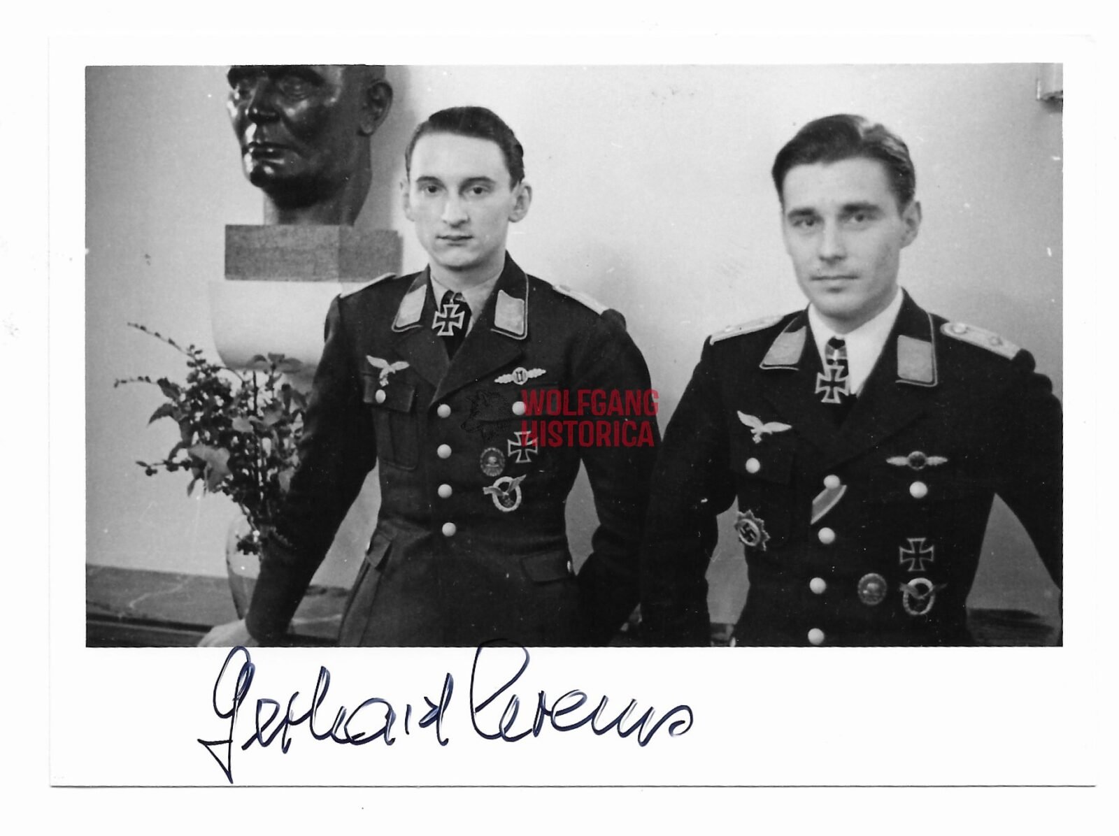 Original Postwar Signature on a Postwar Photo of Gerhard Krems. Oberleutnant Gerhard Krems (04.05.1920 † 12.02.2017) earned the Ritterkreuz on May 25, 1942 as Oberleutnant und Flugzeugführer in the 2. Staffel/ Kampfgeschwader 27 “Boelcke”. Good condition. Postcardsize.