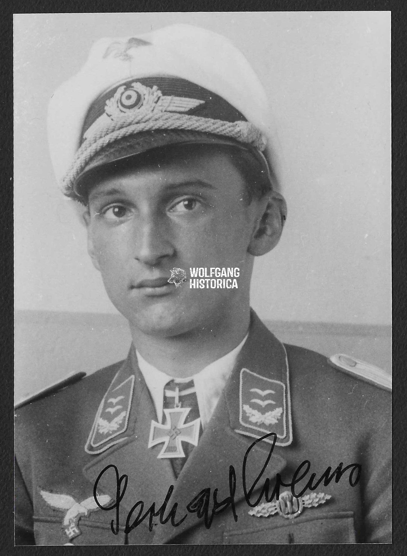 Original Postwar Signature on a Postwar Photo of Gerhard Krems. Oberleutnant Gerhard Krems (04.05.1920 in Dresden † 12.02.2017 in Berlin) earned the Ritterkreuz des Eisernen Kreuzes on May 25, 1942 as Oberleutnant und Flugzeugführer in the 2. Staffel/ Kampfgeschwader 27 “Boelcke”. Condition as seen. Postcardsize.