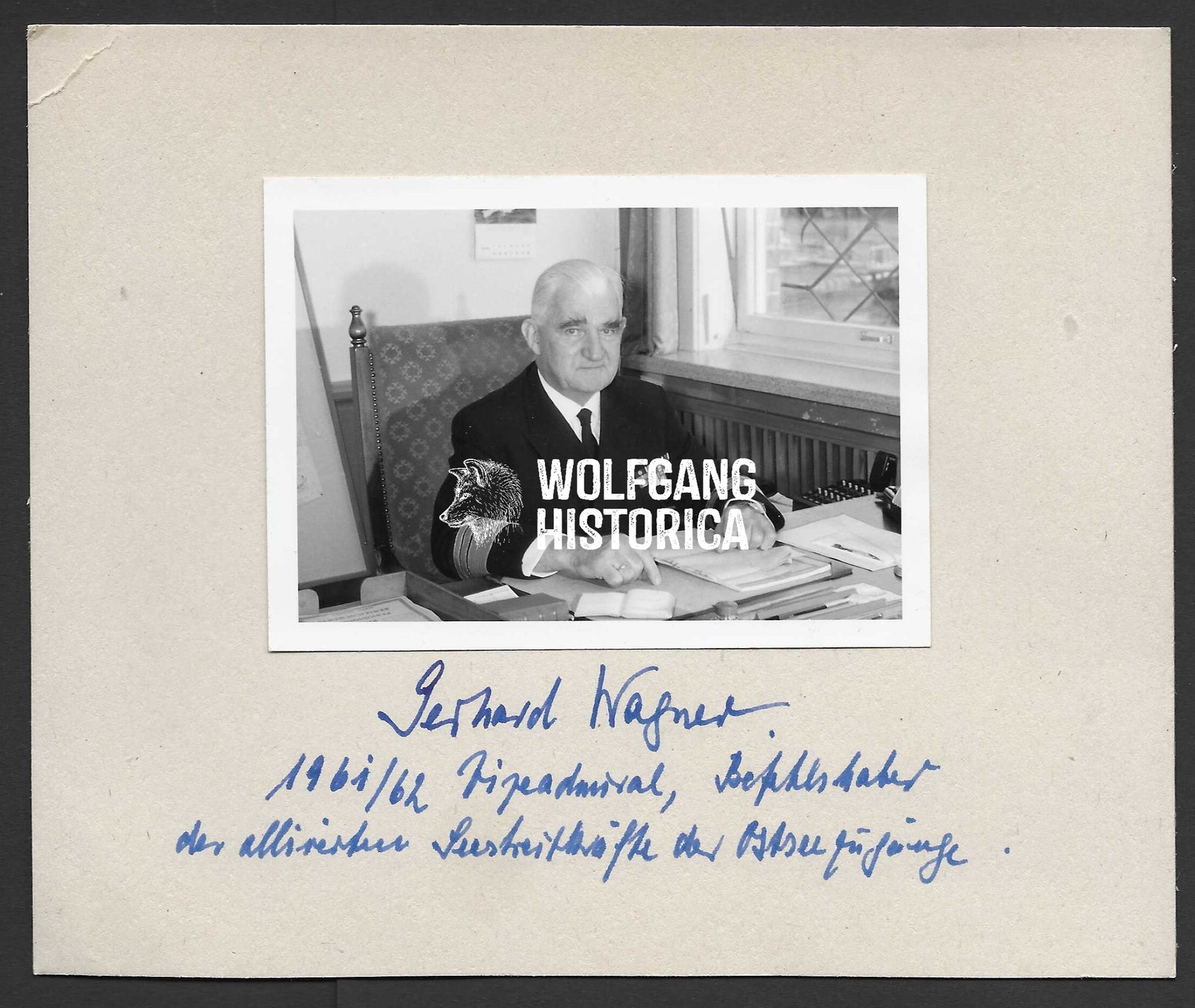 Original postwar signature of Gerhard Wagner (1898–1987), German naval officer and later Konteradmiral of the Bundesmarine, presented on a cardboard display board with an affixed period photograph.