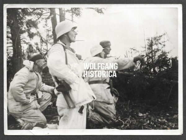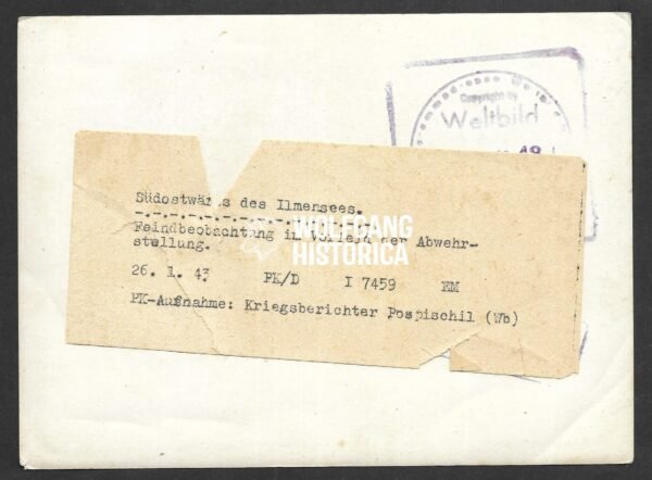 An atmospheric Weltbild Eastern Front press photograph, offering a glimpse into daily Wehrmacht operations during the bitter winter of 1942–43. The combination of precise geographic reference (“southeast of Ilmensee”) and intact period caption makes this a valuable piece for collectors of Eastern Front photography and wartime propaganda material.