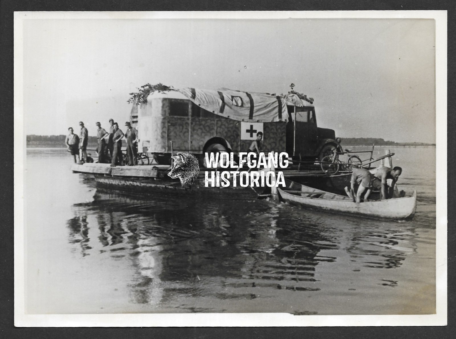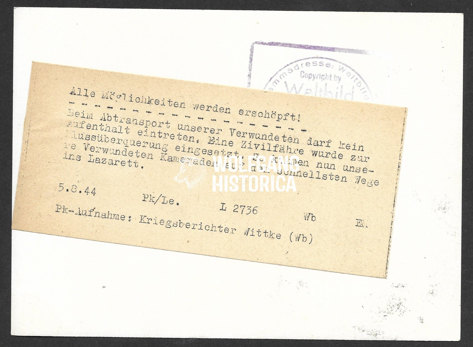 “Alle Möglichkeiten werden erschöpft! Beim Abtransport unserer Verwundeten darf kein Aufenthalt eintreten. Eine Zivilfähre wurde zur Flussüberquerung eingesetzt. So kommen nun unsere verwundeten Kameraden auf den schnellsten Wege ins Lazarett.”