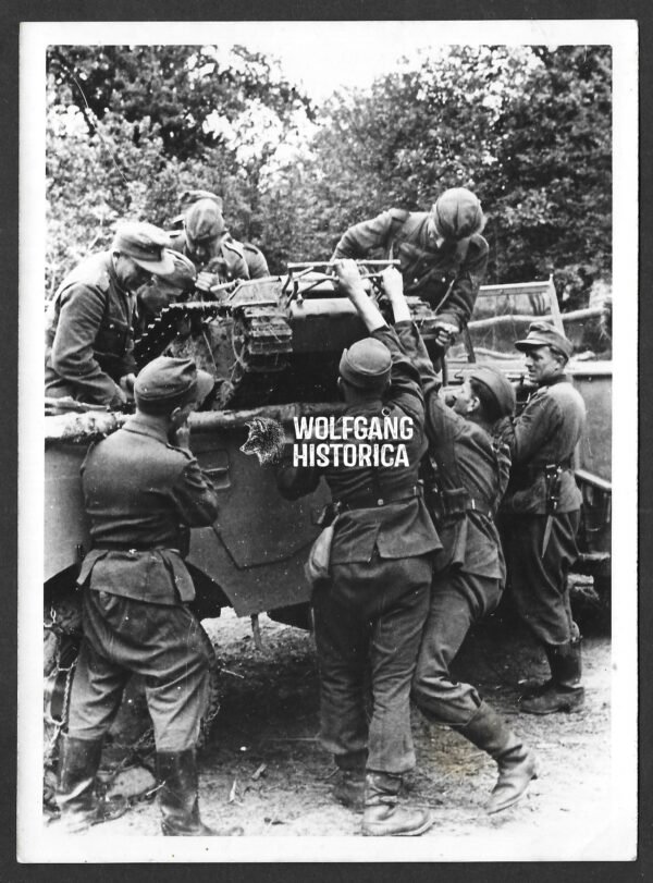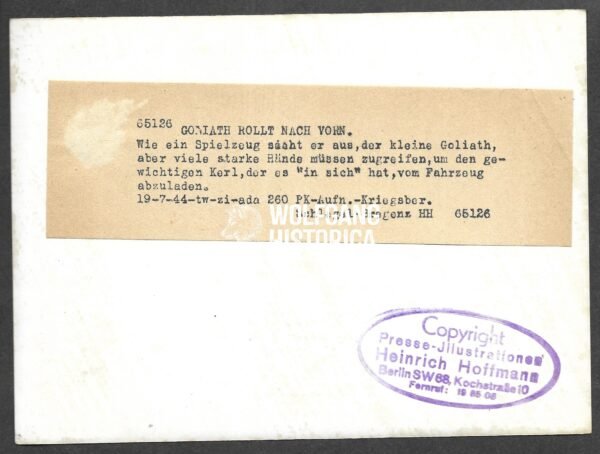 Original Heinrich Hoffmann press photos of the Goliath demolition vehicle are rare and highly collectible due to the weapon’s limited operational use and iconic appearance. This example, with its humorous wartime caption and full documentation, is a particularly desirable piece for collectors of Wehrmacht technology, propaganda photography, and armored warfare history.