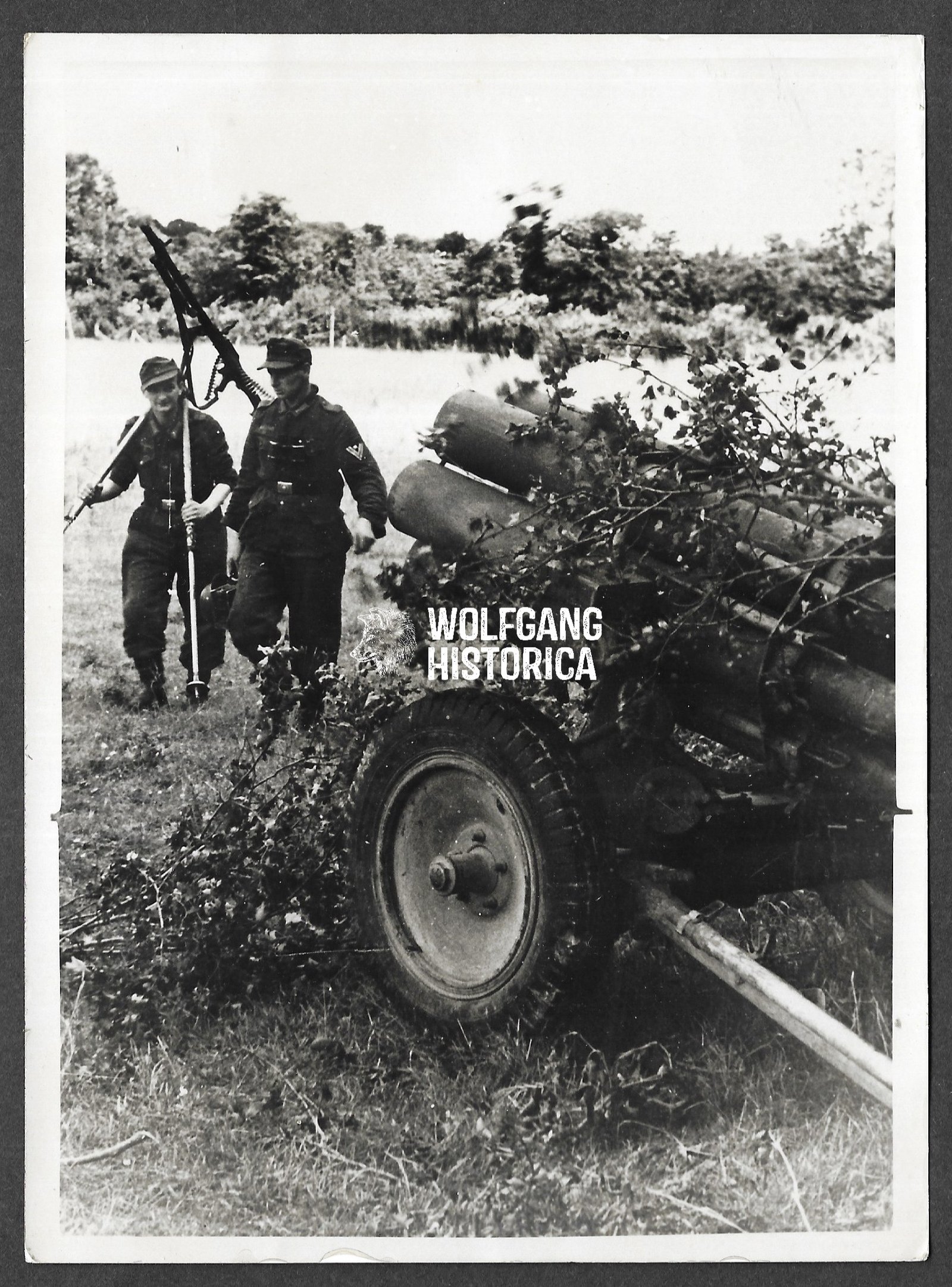 A fine and authentic Weltbild press photo capturing one of the iconic weapons of the German army — the Nebelwerfer. With its complete typed caption and period agency stamp, this photograph offers excellent provenance and is ideal for collectors focused on German artillery, Normandy operations, or WWII propaganda photography.