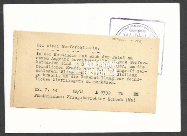 “Bei einer Werferbatterie. In der Normandie hat sich der Feind zu neuem Angriff bereitgestellt. Eigene Werferbatterien sind in Stellung gegangen, um die feindlichen Kräfte noch vor dem Angriff zu zerschlagen. Flieger-MG werden in Stellung gebracht, um die Feuerstellung vor feindlichen Tieffliegern zu schützen.”