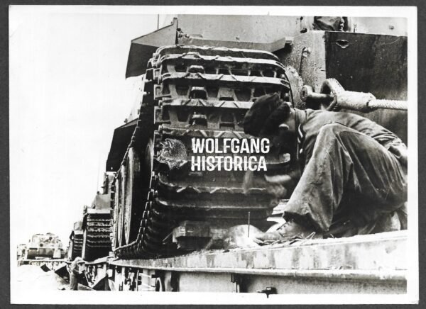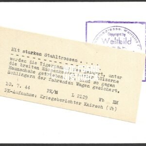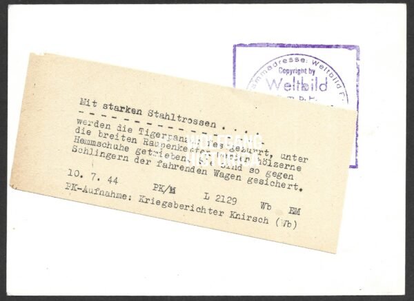 Original Weltbild press photos featuring Tiger tanks are highly desirable among collectors due to their rarity and direct connection to armored warfare on the Western Front. This example, complete with a detailed original typed caption slip and agency stamp, offers both visual impact and historical depth — a fine addition to any WWII armor or propaganda photo collection.