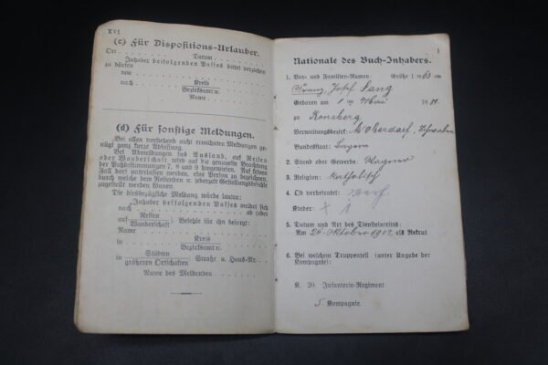 An authentic First World War Militärpass belonging to Franz Josef Lanz (b. 1 May 1881). His service record spans multiple frontline units of the Imperial Army, including the famed Bavarian Reserve Infantry Regiment 17, a regiment that fought in some of the heaviest battles of the Western Front.