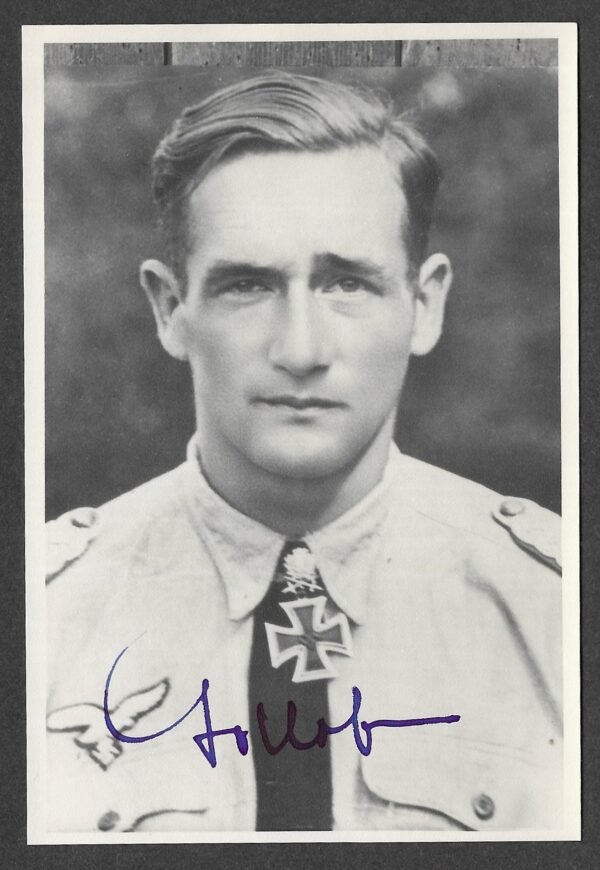 Original Postwar Signature on a Postwar Photo of Gordon Mac Gollob. Generalmajor Gordon Mac Gollob (16 June 1912, Vienna † 7 September 1987, Sullingen) was one of the Luftwaffe’s most renowned fighter aces of the Second World War, ultimately rising to the rank of Generalmajor der Luftwaffe. Over the course of his career he achieved 150 aerial victories, becoming one of the elite recipients of the Knight’s Cross with Oak Leaves, Swords and Diamonds.
