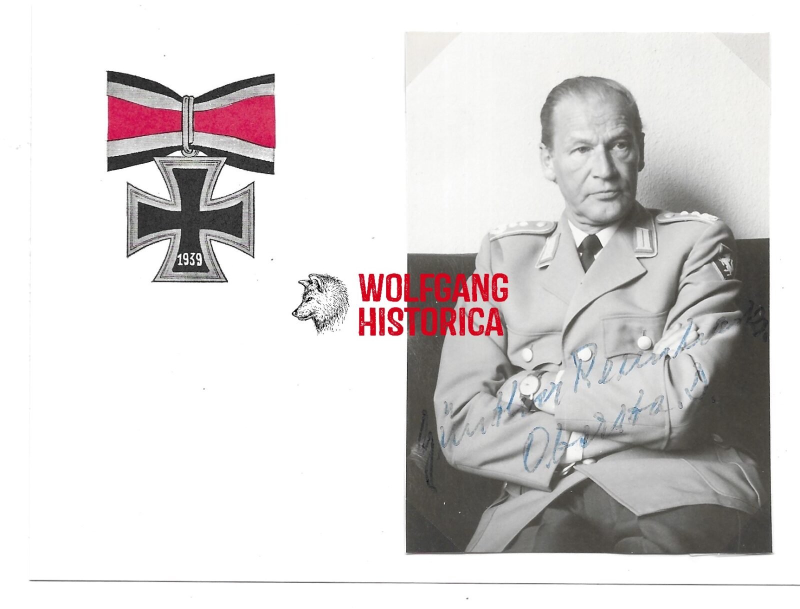 Original Postwar Signature on a Postwar Photo of Günther Rennhack. Hauptmann Günther Rennhack (21.11.1917 † 25.06.1996) earned the Ritterkreuz on December 30, 1944 as Hauptmann und Kommandeur of the Panzerjäger-Abteilung 1818 of the 18. Volksgrenadier-Division. Smaller size, attached with photo corners on PC-sized card.