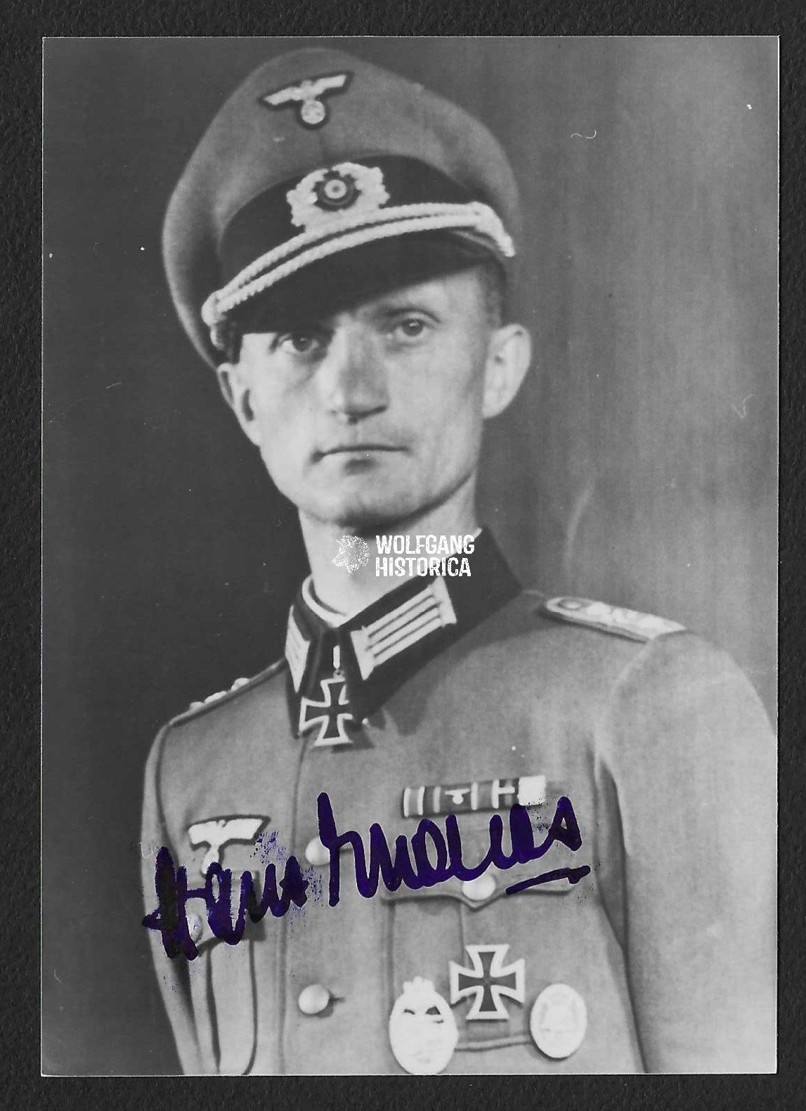Original Postwar Signature on a Postwar Photo of Hans Endres. Major Hans Endres (05.06.1915 † 05.10.2004) earned the Ritterkreuz des Eisernen Kreuzes on August 14, 1943 as Hauptmann und Führer of the Panzer-Artillerie-Regiment 74 of the 2. Panzer-Division.