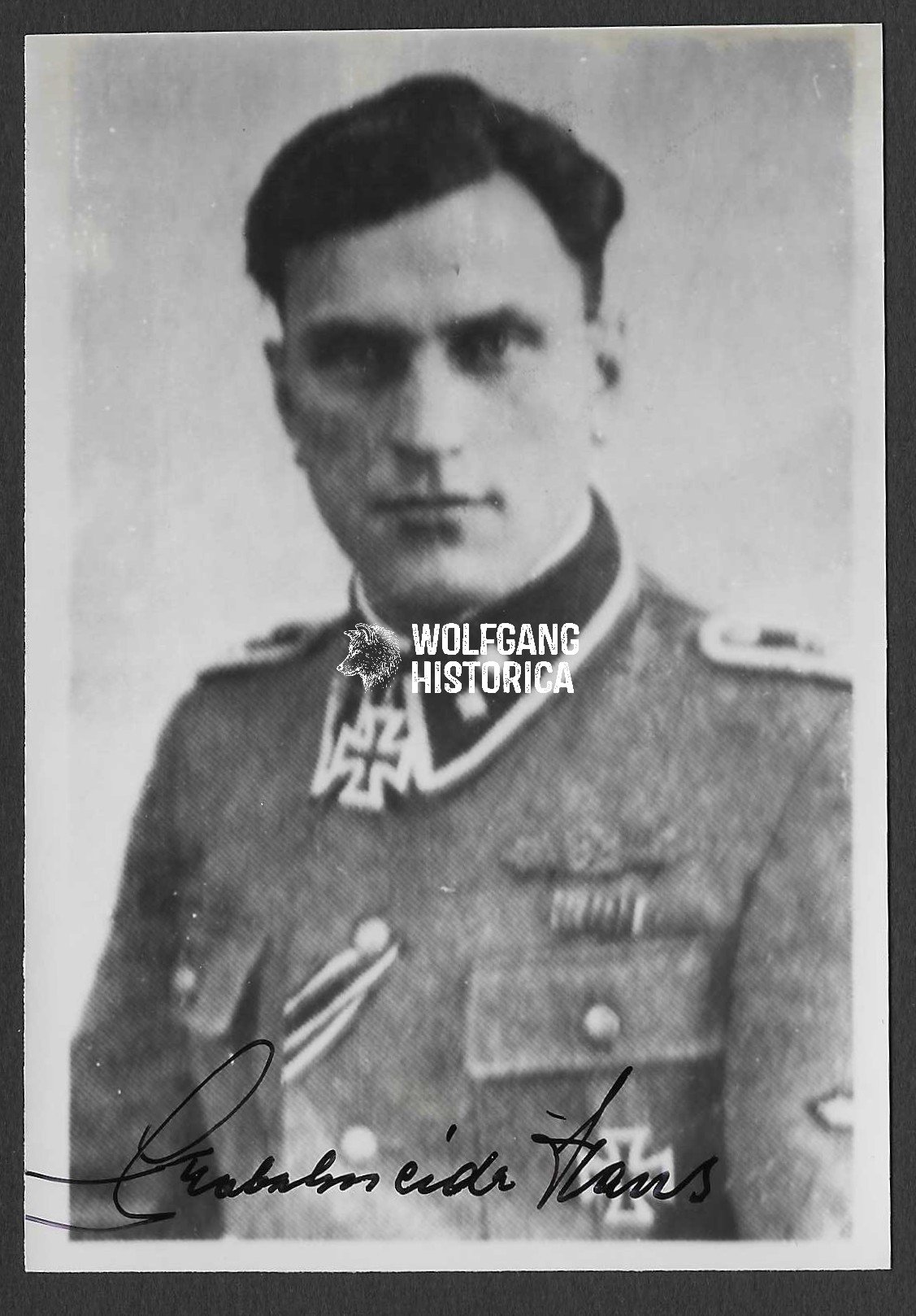 Original Scarce Postwar Signature on a Postwar Photo Hans Schabschneider. SS-Hauptscharführer Hans Schabschneider earned the Ritterkreuz (Knight’s Cross) with the 4./ SS-Panzer-Artillerie-Regiment 2 “Das Reich” during Normandy. On the August 27th, 1944, he was in charge of the munitions of the 4th Battery, 2nd SS Artillery Regiment, Das Reich. When fighting started at Coutances he formed a company of mixed Army and Waffen SS men that had lost their units, committed them to an assault on the American line capturing 12 trucks and 120 American prisoners of war. Good Condition. Bit smaller then Postcardsize.
